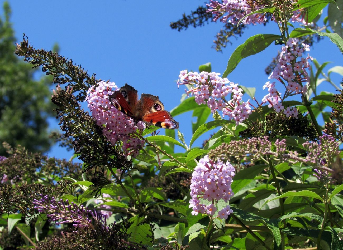 - Budleja Dawida Buddleja davidii – Znana jako "motyli krzew", przyciąga liczne gatunki motyli, m.in. rusałki (pawik, admirał, ceik, pokrzywnik), bielinki oraz modraszki. To okazały krzew osiągający wysokość 2-5 m, o luźnym, rozłożystym pokroju i łukowato przewieszających się pędach. Tworzy długie (do 30 cm), stożkowate, gęste kwiatostany w odcieniach fioletu, różu, bieli lub purpury o intensywnym zapachu. Kwitnie od czerwca do października.