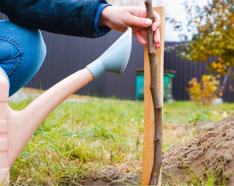 - Pielęgnacja po posadzeniu: należy obficie podlać sadzonkę wodą (ok. 15-20 l) i uzupełnić ewentualne braki ziemi. Następnie wystarczy przymocować drzewko do palika w ósemkę przy pomocy miękkiego materiału i wyściółkować powierzchnię wokół pnia.
