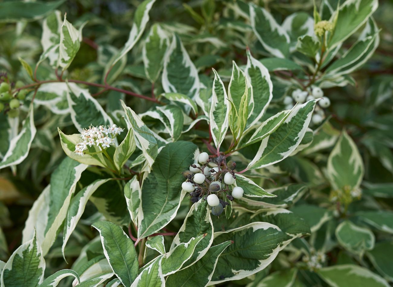 - Dereń biały 'Sibirica Variegata' – to odmiana, która również dorasta do 2 metrów wysokości. To, co ją wyróżnia to estetyczne, strzępiaste liście, które mają biało-różową obwódkę i zielony środek. Tworzy białe kwiaty, które skupione są w kiściach. Na jesień przekształcają się w białe owoce.