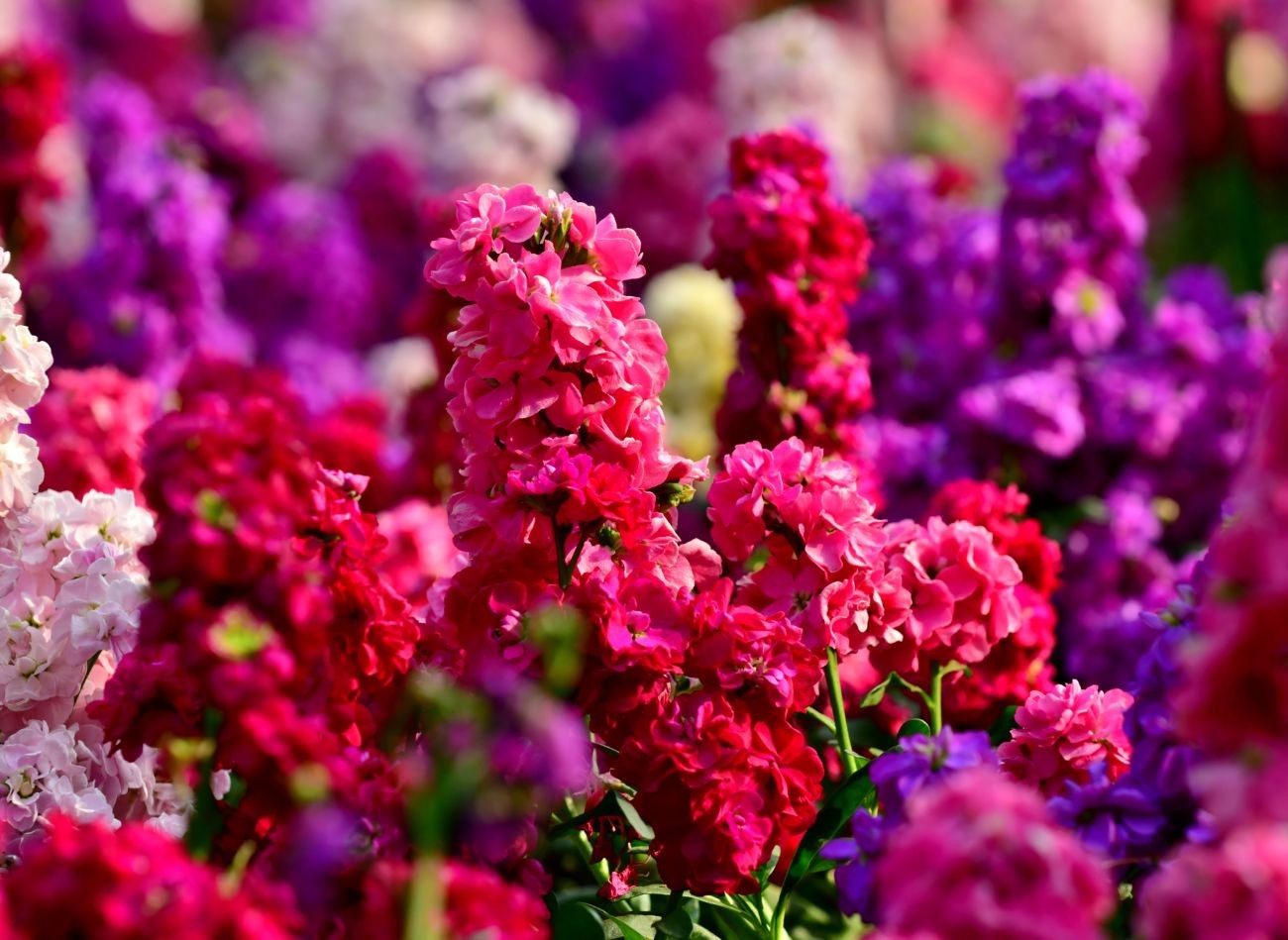 - lewkonie (Matthiola incana): gęste, kłosowate kwiatostany, osiągające 30–50 cm wysokości, składają się z pełnych lub pojedynczych kwiatów w odcieniach lawendy, różu, bieli lub głębokiej purpury. Każdy kwiat, o średnicy 2–3 cm, ma aksamitne płatki, które zdają się lśnić w promieniach słońca. Liście lewkoni są wąskie, lancetowate, w odcieniu szarozielonym. Wieczorem roztaczają intensywny, słodki zapach, który przyciąga nocne zapylacze. Rozpocznij siewki w lipcu w pojemnikach i przenieś je do gruntu w sierpniu. Potrzebują temperatury około 21°C i dostępu do światła, by wykiełkować w ciągu tygodnia;