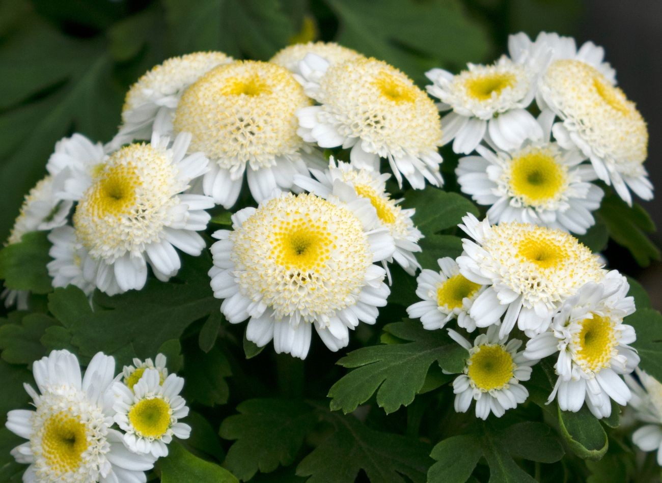 - złocień maruna (Tanacetum parthenium): drobne, białe kwiaty, o średnicy 1–2 cm, przypominają miniaturowe stokrotki z żółtymi środkami, zebrane w luźne baldachy. Rośliny osiągają 30–60 cm wysokości, a ich jasnozielone, aromatyczne liście, lekko pierzaste, dodają rabatom sielskiego charakteru. Kwiatostany tworzą subtelne chmury, idealne do ogrodów w stylu wiejskim lub angielskim;