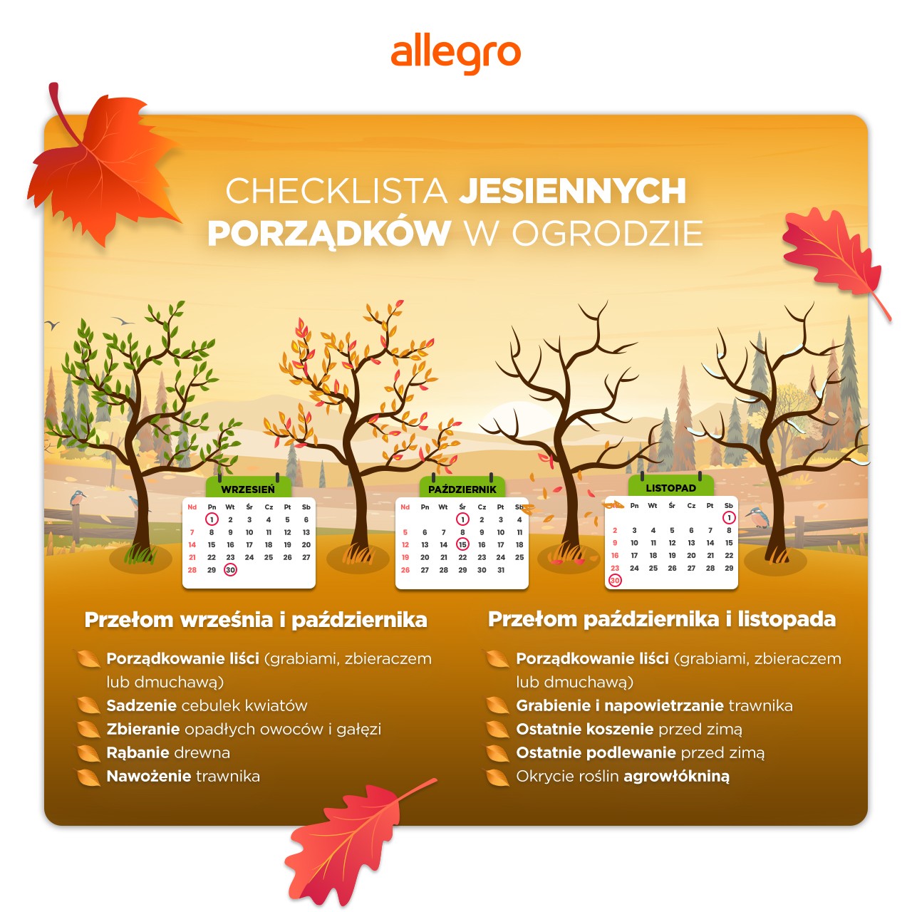 Jesienią nasz pięknie przystrzyżony trawnik, nagle pokrywa dywan z liści. Z jednej strony wygląda to malowniczo, z drugiej – gdy zostaną na ziemi, robią więcej szkody niż pożytku. Tworzą bowiem wilgotną warstwę, która odcina trawnikowi dostęp do powietrza i światła. Dlatego tak ważne jest regularne grabienie przez całą jesień. Na mniejszych powierzchniach uporamy się z tym, sięgając po druciane grabie do liści. Jeśli działka jest większa, warto skorzystać ze zbieracza liści albo dmuchawy z funkcją odkurzania i rozdrabniania – urządzenie błyskawicznie upora się z całym bałaganem. Gdzie szukać sprzętów do ogrodu? Wystarczy zajrzeć na Allegro, gdzie znajdziemy wszystkie potrzebne narzędzia w jednym miejscu.