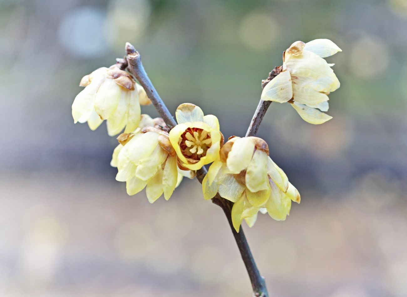 Na nagich pędach kwiaty pojawiają się od lutego do marca (czasem wcześniej w łagodne zimy). Mają dzwonkowaty kształt z jasnożółtymi, woskowatymi płatkami zewnętrznymi i purpurowo-brązowymi wewnętrznymi, co nadaje im charakterystyczny kontrast. Ich aromat jest intensywnie słodki, dzięki czemu może być wyczuwalny z dużej odległości w cieplejsze dni.