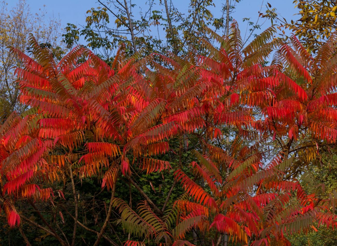- Sumak octowiec – nazywany jest “zemstą sąsiada”, wszystko z powodu swojego ekspansywnego charakteru. Roślina ta jest niezwykle dekoracyjna. Jesienią przybiera piękne kolory czerwieni i pomarańczy, a jej owoce mają kształt szyszek. Jest także odporny na ekstremalne warunki pogodowe. Sumak octowiec rozrasta się za pomocą rozłogów korzeniowych i szybko opanowuje sąsiednie tereny.