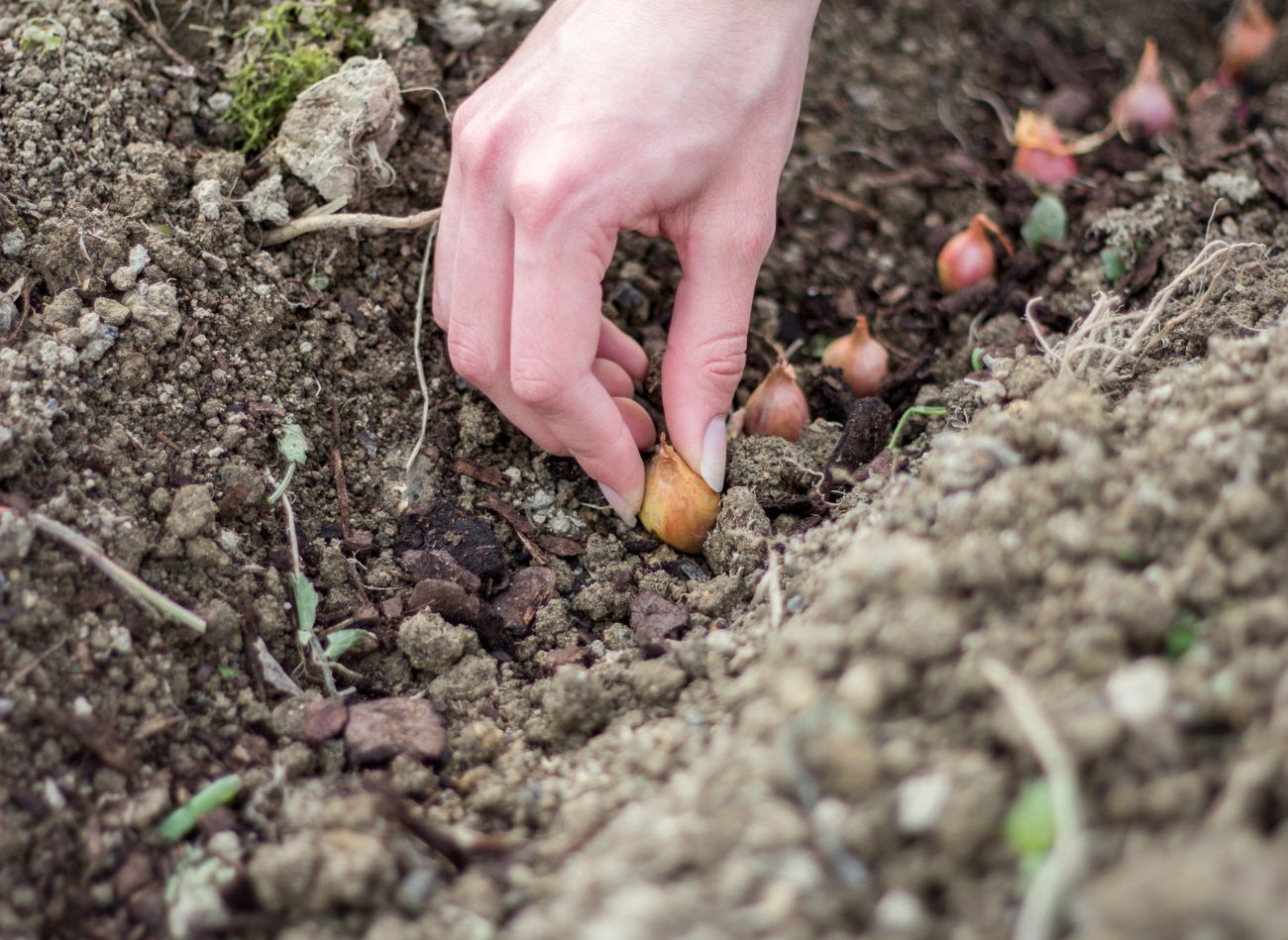 Jesienią cebulę sadzi się nieco głębiej niż wiosną – ok. 4-6 cm pod powierzchnią ziemi. Fot. smuki/123RF.com