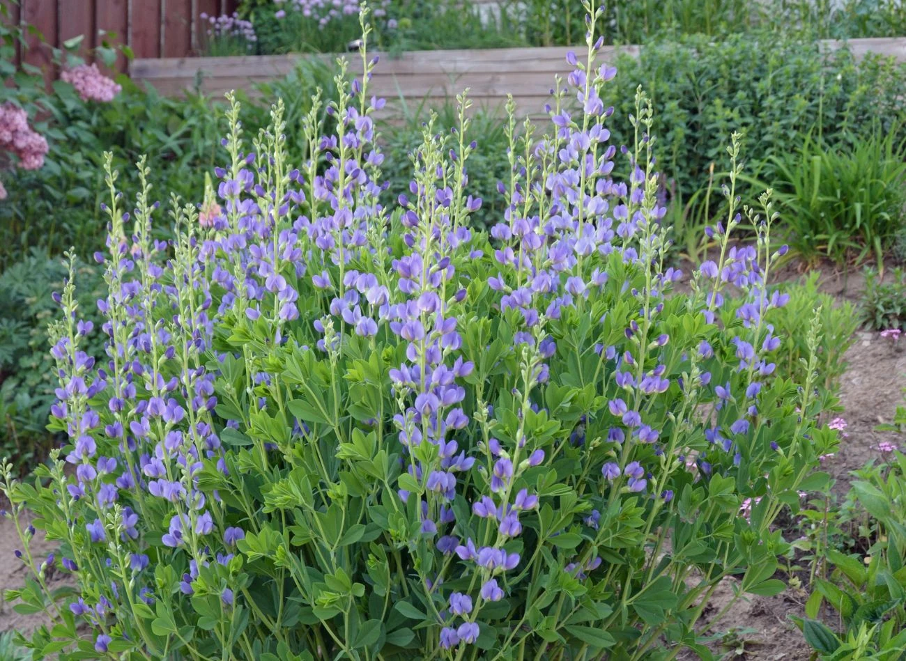 - Baptysja błękitna – ta długowieczna bylina doskonale radzi sobie z suszą i nie potrzebuje częstego nawożenia. Będzie zdobić ogród przez 20-30 lat.