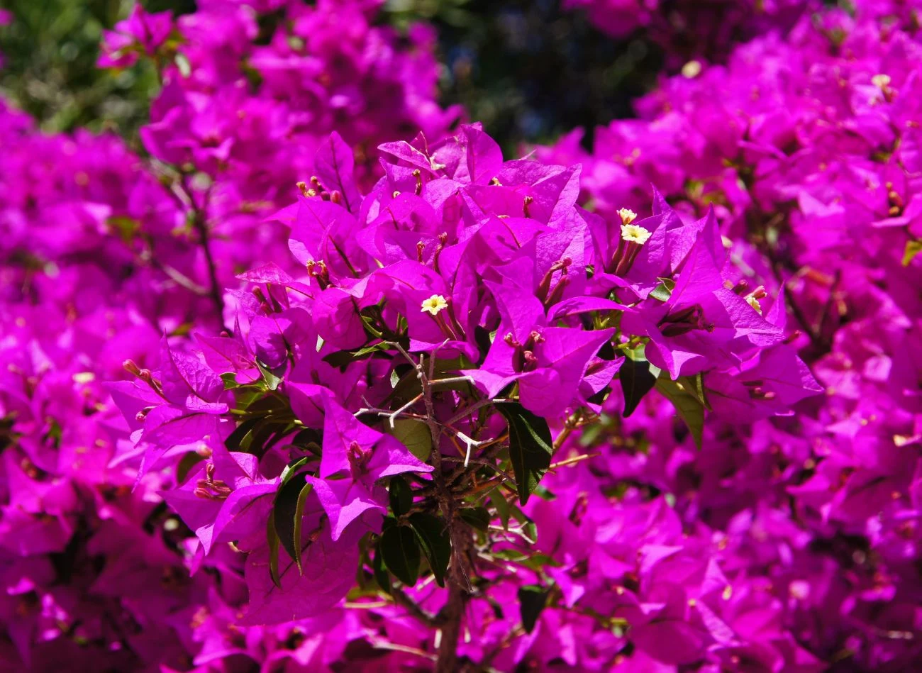 Bugenwilla to efektowna, tropikalna roślina pnąca pochodząca z Ameryki Południowej. Jej największą ozdobą są intensywnie wybarwione, papierowe podsadki (tzw. przykwiatki), które otaczają drobne, niepozorne kwiaty. Barwa podsadek może być różnorodna: od różowej, fioletowej i czerwonej, po pomarańczową, żółtą i białą. Roślina ta posiada cierniste, drewniejące pędy i błyszczące, zielone liście.
