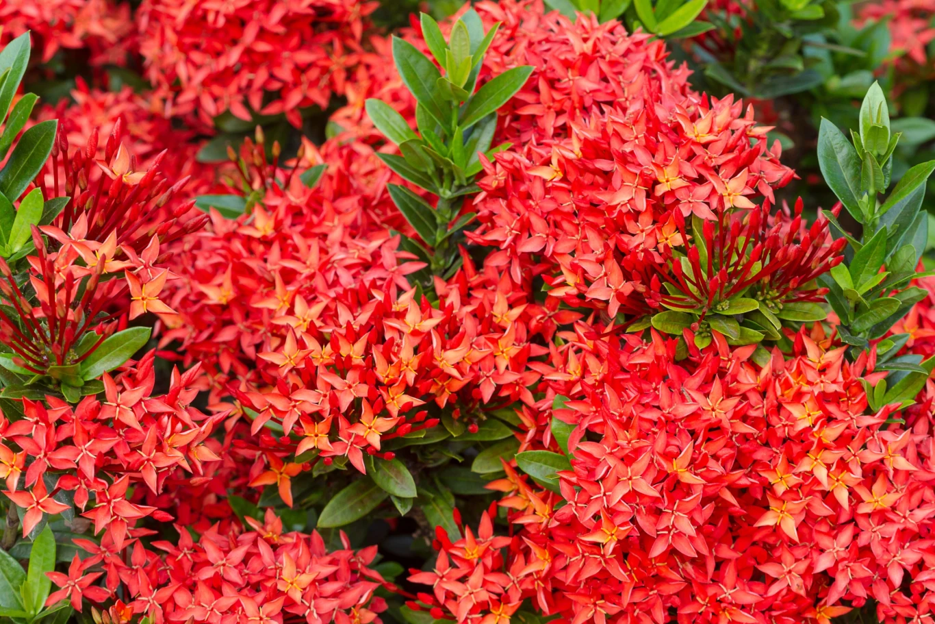 Iksora szkarłatna – krzew z kwitnącymi baldachami