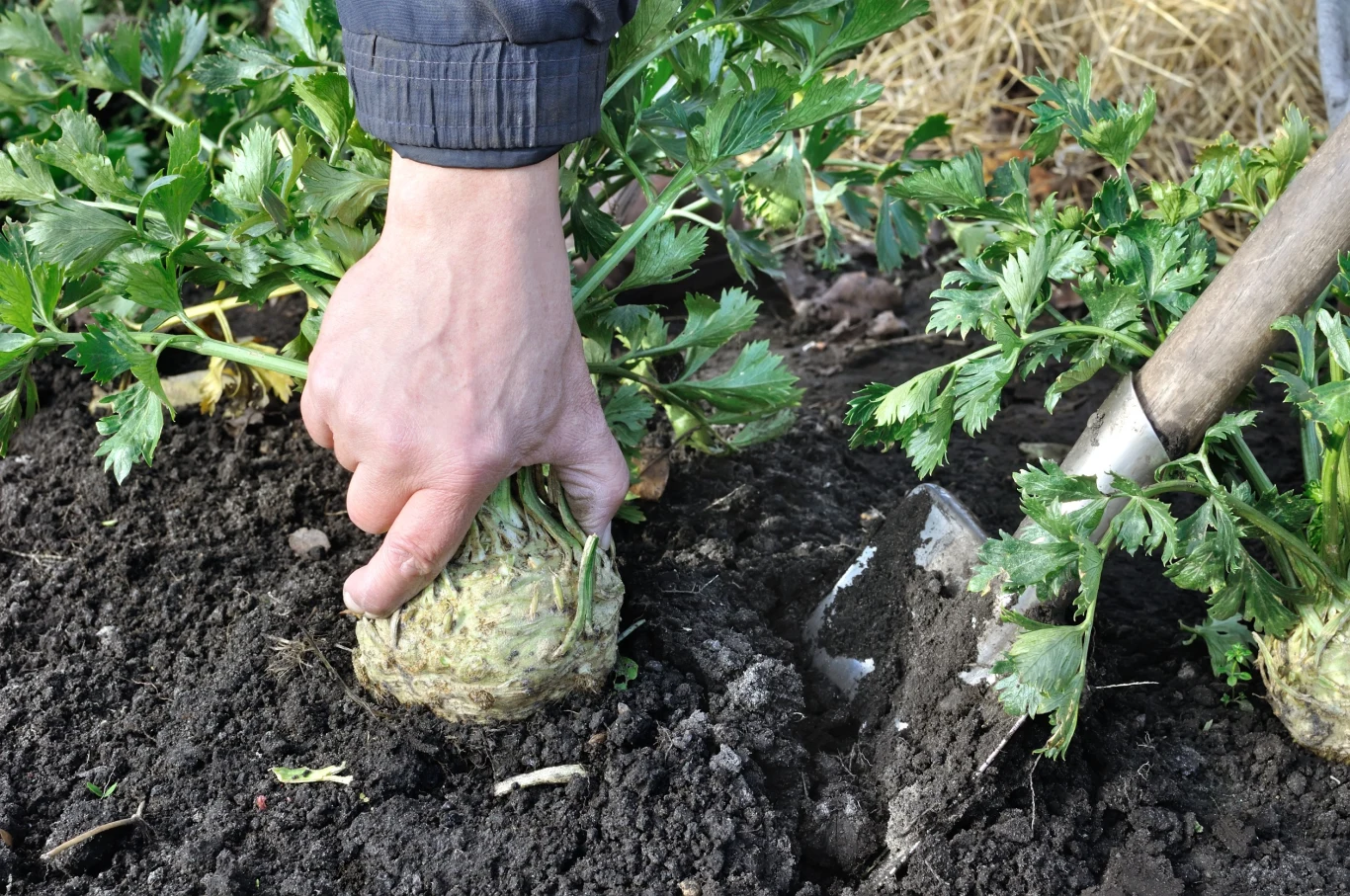- Późnym latem odgarniamy glebę – gdy zobaczymy, że korzeń selera urósł, delikatnie odsuwamy glebę wokół, odsłaniając go nawet do połowy. Zabieg ten sprawi, że roślina nie wytworzy niepotrzebnych, bocznych korzonków.