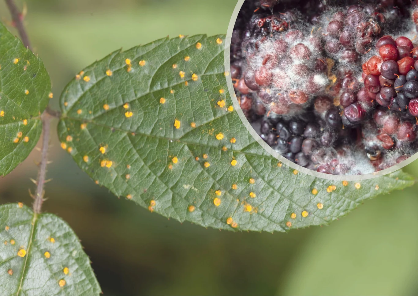 Rdza jeżyny bezkolcowej jest groźną chorobą, ponieważ potrafi zniszczyć ponad połowę plantacji. Pierwszymi objawami rdzy są żółte lub żółto - pomarańczowe zmiany, które przypominają poduszeczki. Zawierają one zarodniki grzybów. Objawy te obserwujemy na młodych pędach i na dole liści. Z kolei na górnej warstwie liści widzimy jasnobrązowe plamy z czerwonymi obwódkami.