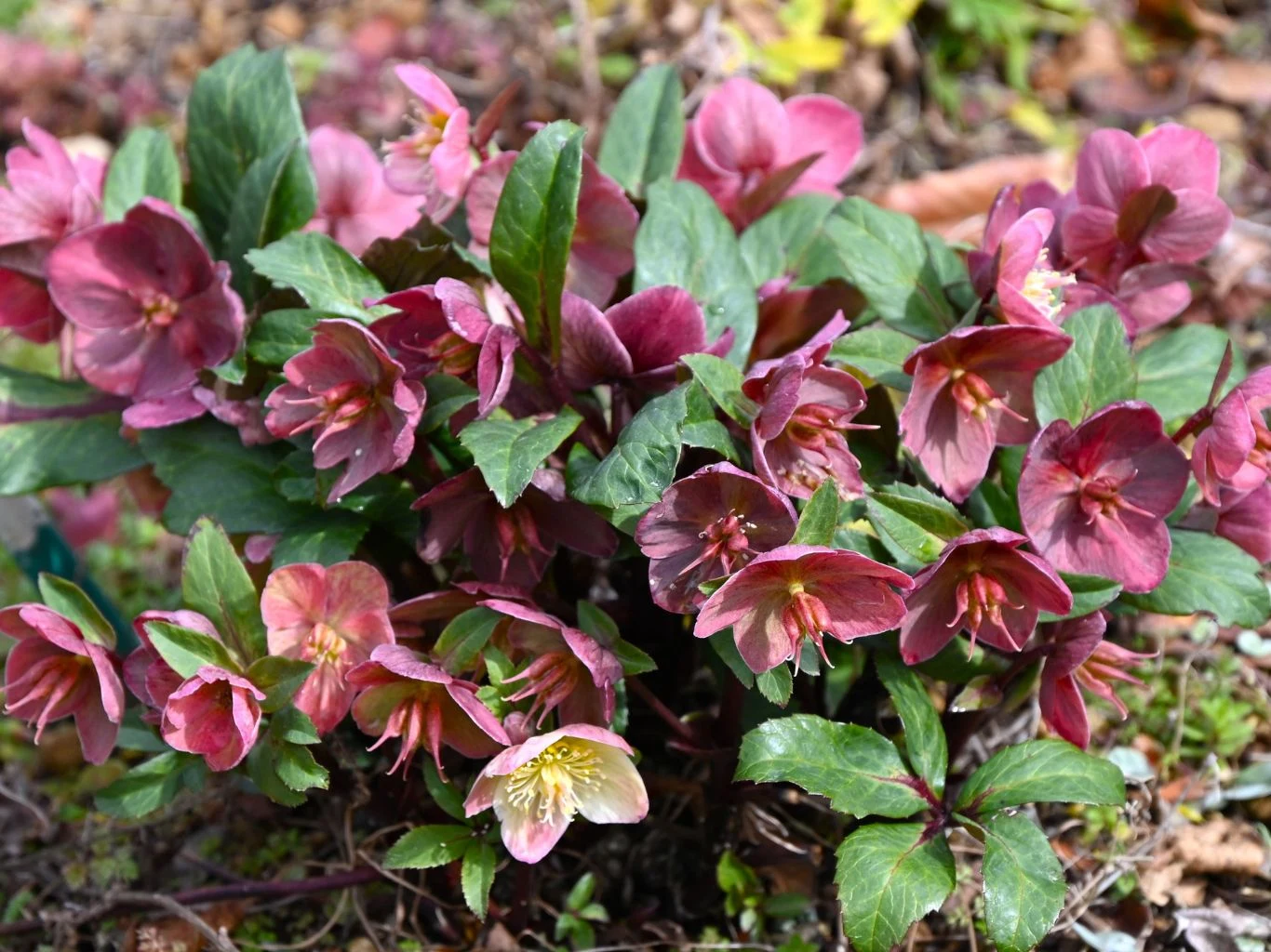 Kępa ciemierników o różowych kwiatach i zielonych liściach rośnie w ogrodzie na tle ziemi i resztek roślinnych.