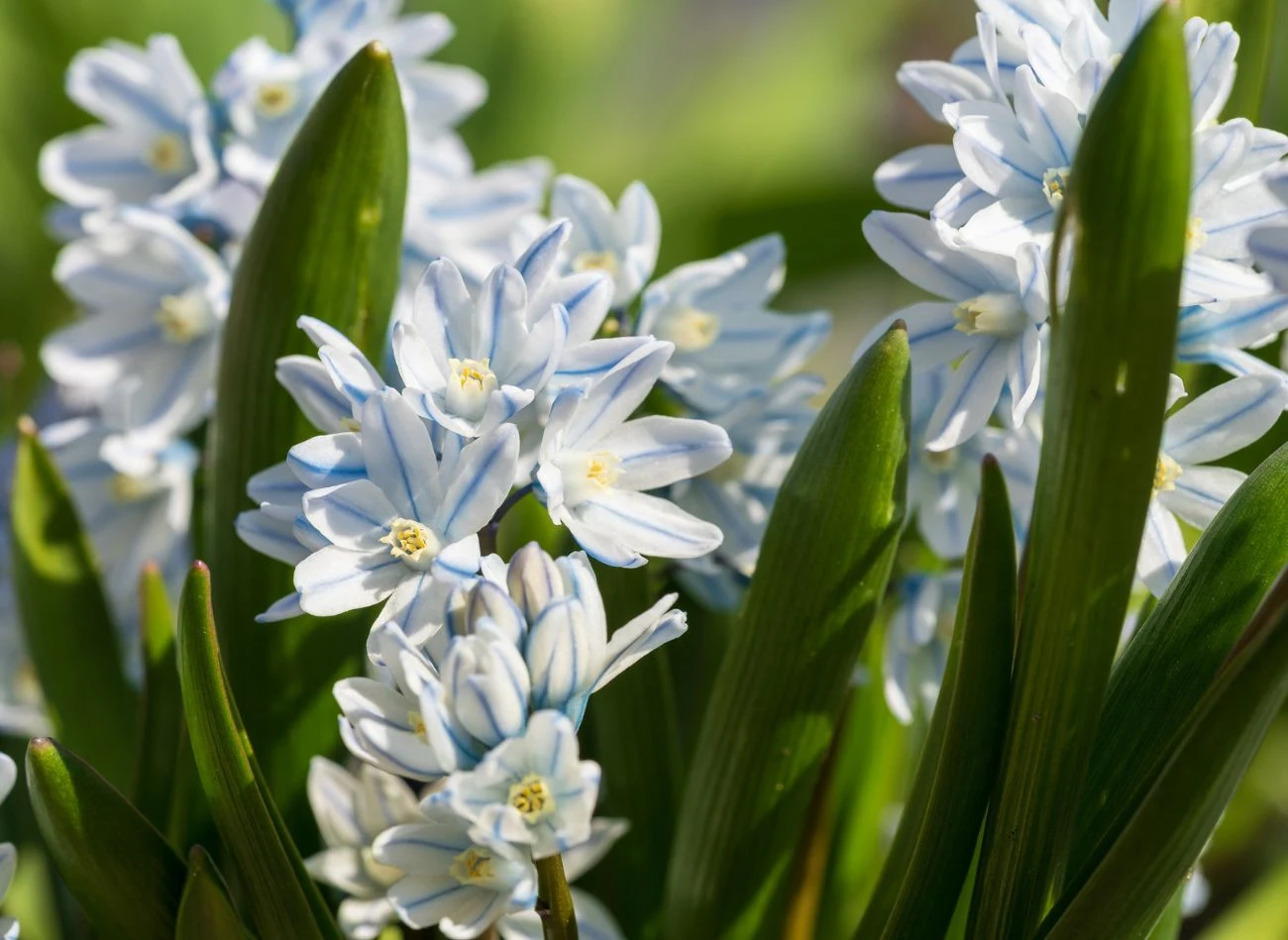 - Puszkinie – przypominają miniaturowe hiacynty, o białych kwiatach z niebieskimi paskami.