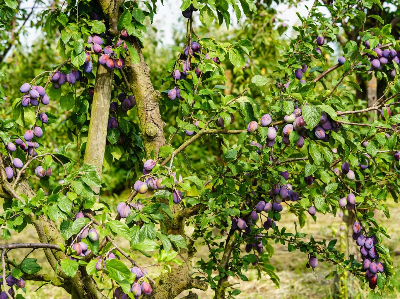 Gałęzie drzewa śliwkowego uginające się pod ciężarem dojrzałych, fioletowych śliwek na tle zielonych liści w sadzie owocowym.