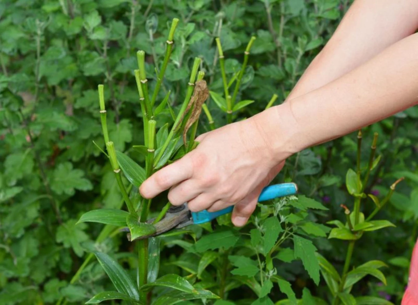 Z przekwitłych lilii usuwamy wyłącznie suche kwiaty wraz z wierzchołkiem łodygi, pozostawiając resztę pędu oraz liście. W ten prosty sposób zapobiegniemy tworzeniu nasion i sprawimy, że lilie będą gromadzić zapasy składników odżywczych w cebulach na kolejny sezon. Dzięki temu następnego lata będą kwitły jeszcze piękniej i okazalej. Całą część nadziemną obcinamy na wysokości ok. 2,5 cm nad ziemią dopiero wtedy, gdy liście zżółkną i obumrą.