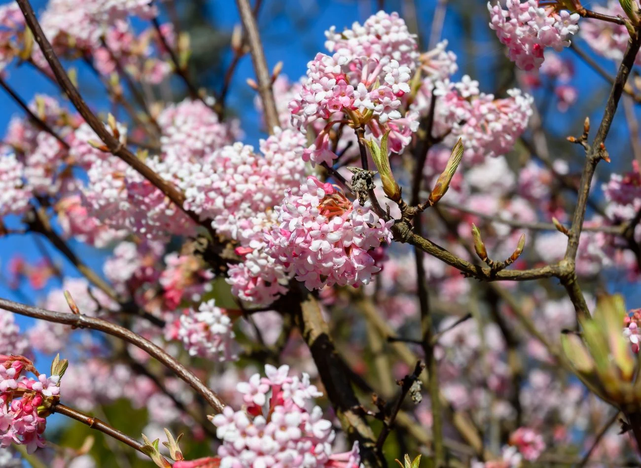 - Kalina wonna 'Farrer’s Pink' - jej k wiaty są większe, bardziej wyraziste i mają w sobie coś z wiosennej rewolucji, przełamując intensywnym różem szarość wczesnych miesięcy roku. Krzew osiąga wysokość do 2,5 metra, a jego pąki, zanim się rozwiną, mają subtelny biały odcień. To wybór dla odważnych, którzy chcą, by ich ogród przyciągał spojrzenia – w połączeniu z białymi odmianami tworzy harmonijną, ale dynamiczną kompozycję. Nazwa pochodzi od nazwiska Reginalda Farrera, brytyjskiego botanika, który sprowadził kalinę wonną z Chin na początku XX wieku. Potrzebuje żyznej gleby i stanowiska osłoniętego od wiatru, by w pełni pokazać swój potencjał. Jesienią jej liście przybierają purpurowo-czerwone tony, dodając ogrodowi jeszcze więcej charakteru;