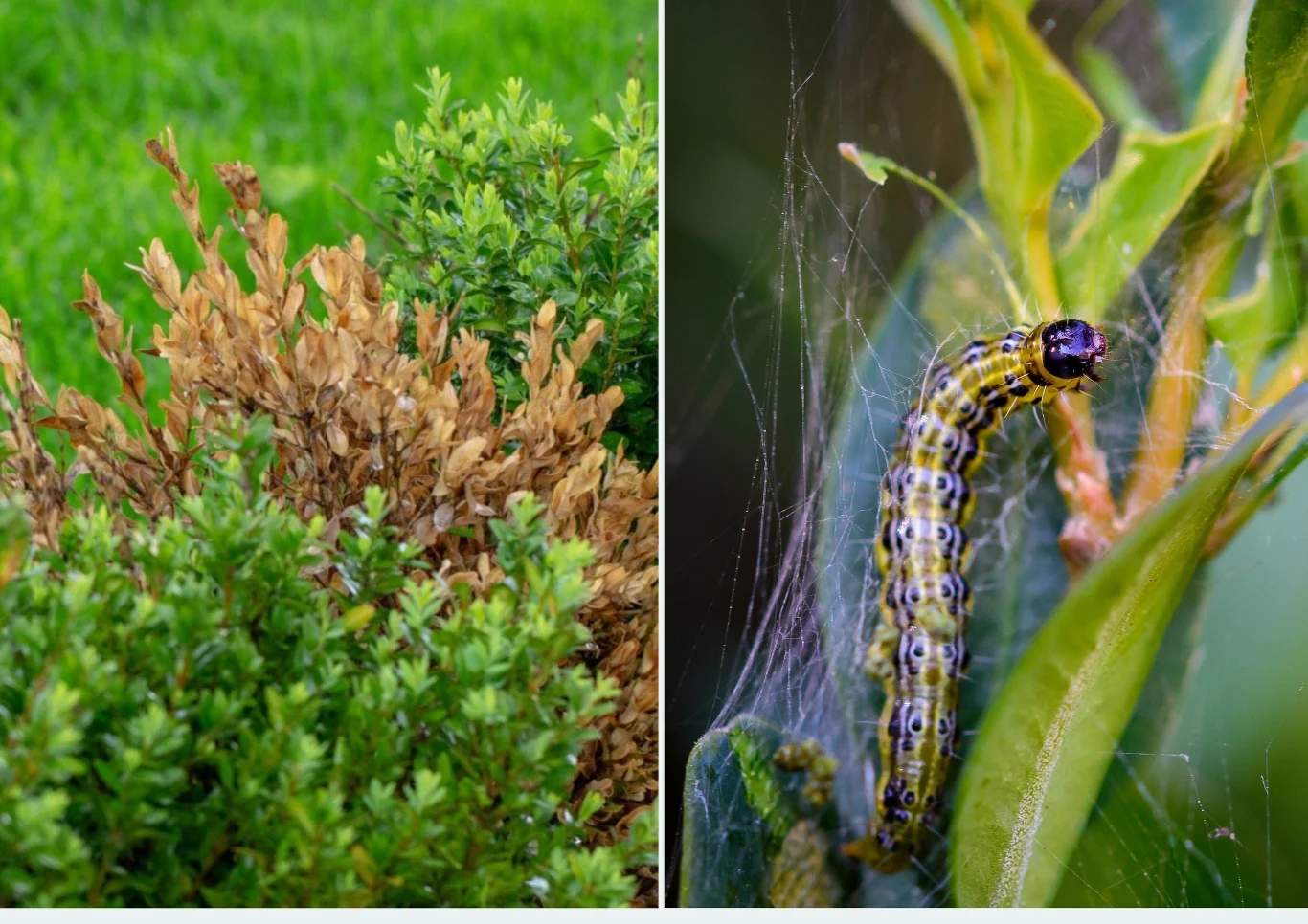 - Ćma bukszpanowa – larwy tego szkodnika żerują na liściach rośliny, wygryzając w nich dziury, a z czasem obgryzając całkowicie miąższ. Obecności tego szkodnika towarzyszy charakterystyczna przędza przypominająca pajęczynę oraz widoczne na liściach grudki odchodów.