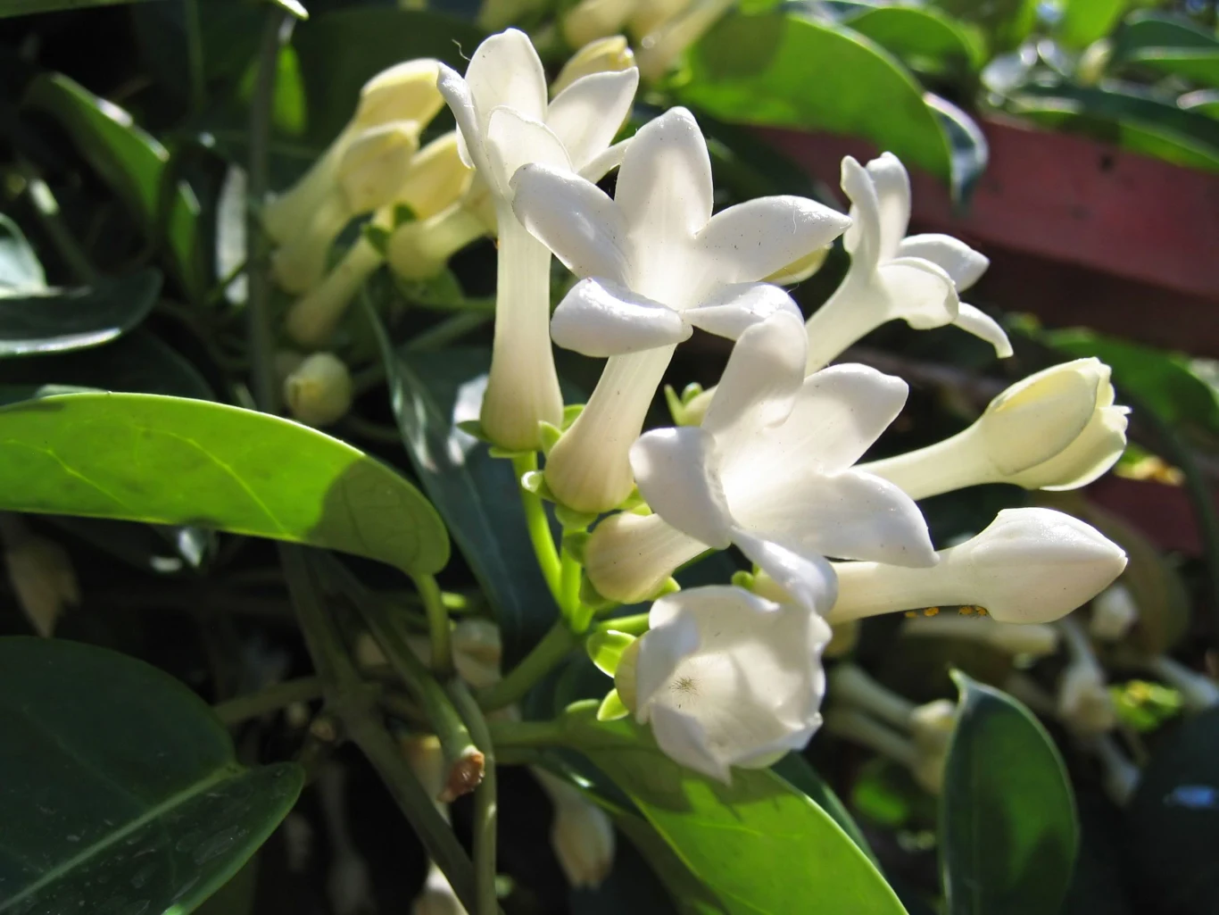 Tak zrobiłam i stefanotis odpłacił się bardzo silnym wzrostem. Po dwóch miesiącach niemal podwoił swoje rozmiary. Na co dzień stoi blisko okna od strony zachodnio-północnej w towarzystwie anturium i dizygoteki, które także lubią wilgotne powietrze i codzienne zraszanie. Na razie pojawiły się jedynie dwa kwiaty, ale czekam na kolejne. Delikatne odżywianie nawozem do roślin kwitnących powinno pomóc. Latem stefanotis najlepiej czuje się w jasnym miejscu, ale ze światłem rozproszonym. Bardzo ostre promienie słoneczne mogą powodować żółknięcie i matowienie liści. Jednak resztę roku, czyli okres mniej więcej od września do maja może spędzić nawet przy oknie od strony południowej, w bezpośrednim nasłonecznieniu.