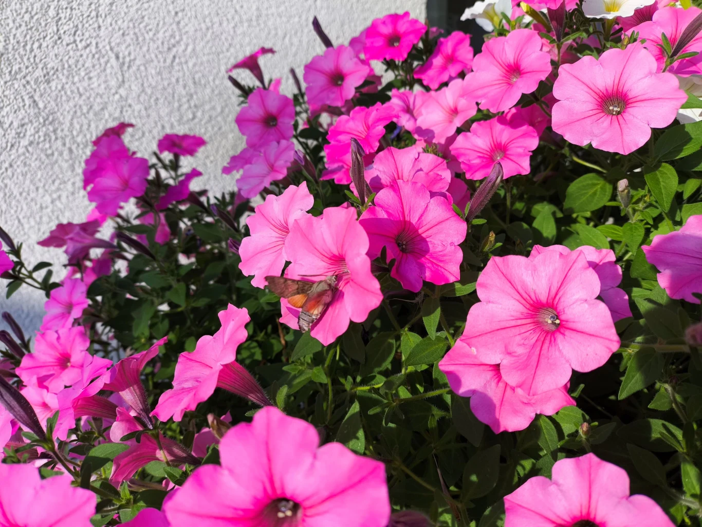 Z własnego doświadczenia wiem, że polski koliber bardzo chętnie odwiedza niektóre kwiaty balkonowe. Pojawił się na moich pelargoniach, fuksjach i astrach. Uwielbia również wszelkie petunie. Supertunie Vista sadziłam w tym roku z nadzieją, że zawita do nich fruczak gołąbek i się nie rozczarowałam – udało mi się go dostrzec już kilka razy.