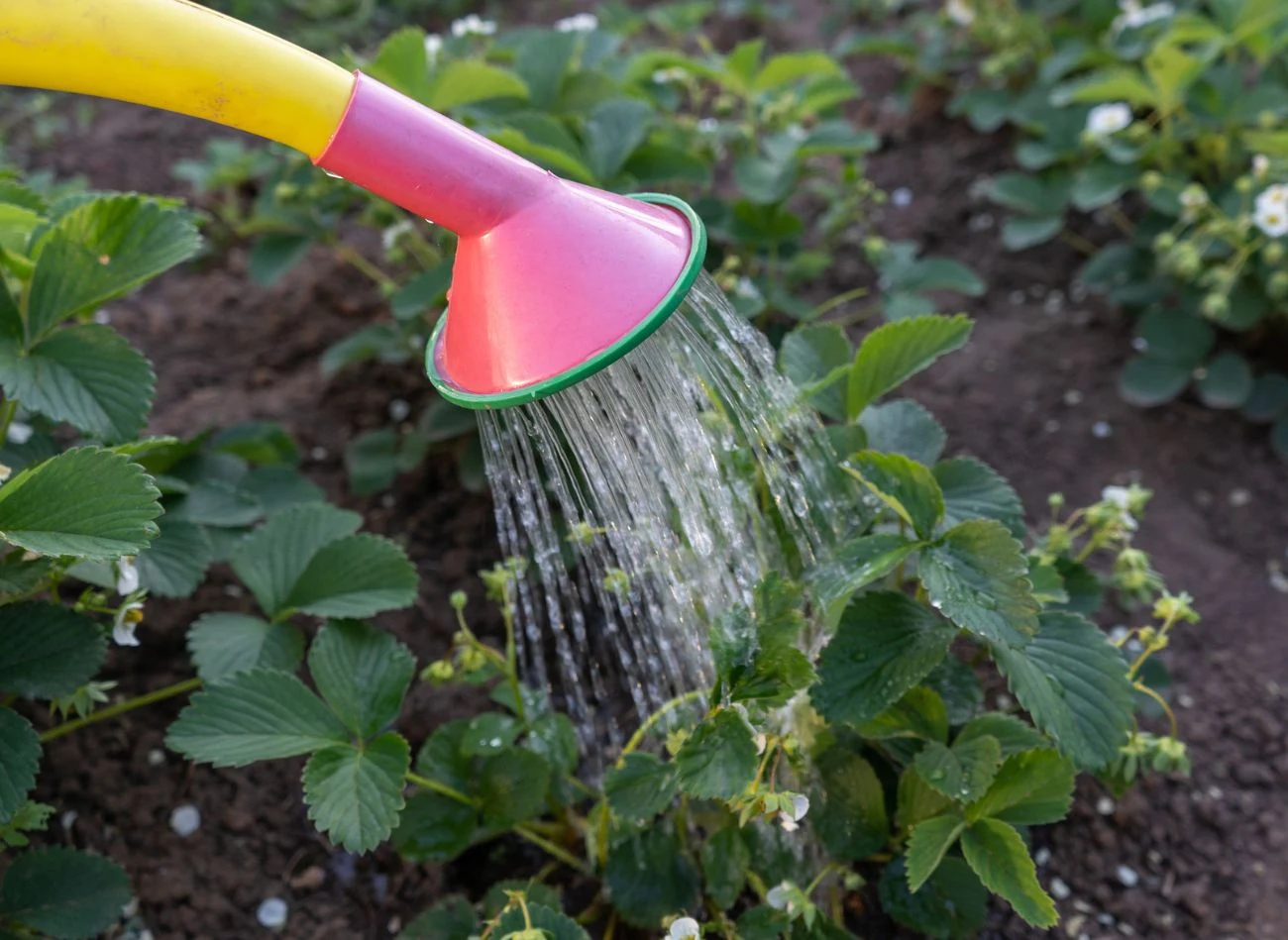 Truskawki lubią wodę, ale nie błoto. Najlepsza praktyka: rano, przy korzeniach, nie po liściach. W donicach – częściej, bo przesychają szybciej. Lepiej podlewać truskawki mniej, ale regularnie.