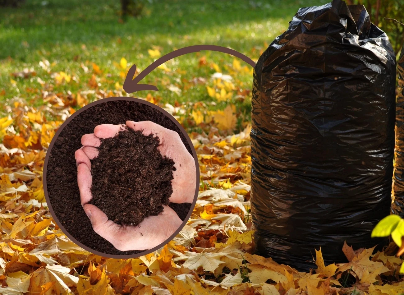 Taki sposób przygotowania ziemi z liści jest bardzo wygodny. Materiał kompostuje się w grubych, foliowych workach.