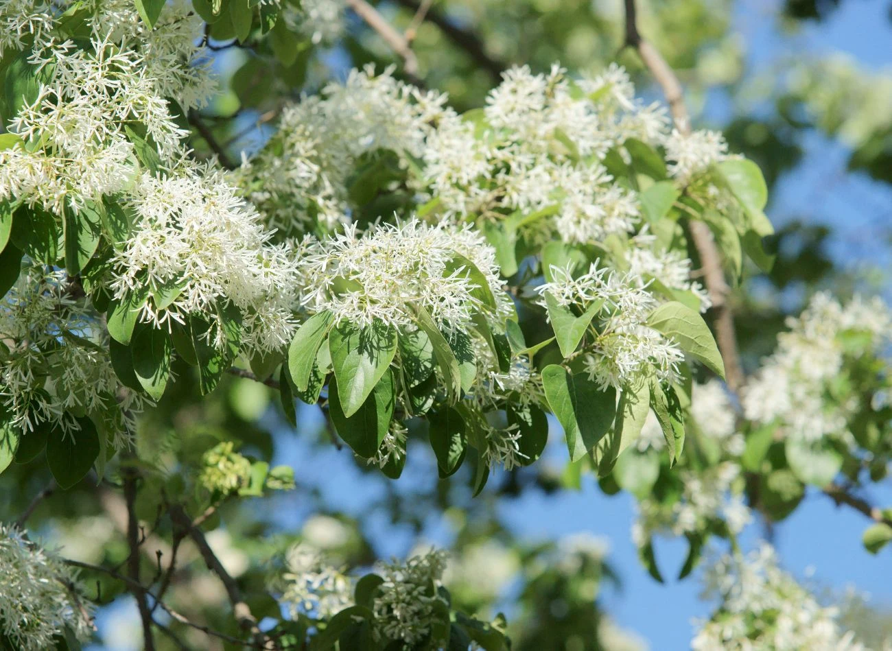 - Śniegowiec chiński ( Chionanthus retusus) – to w pełni mrozoodporne drzewo, które jest niewymagające i proste w uprawie. W czerwcu bardzo intensywnie kwitnie, obsypując się pachnącymi kwiatami przypominającymi płatki śniegu. Gdy otworzą się wszystkie, drzewo wygląda na przykryte śnieżną pierzynką. Efektowna jest także jego łuszcząca się kora.