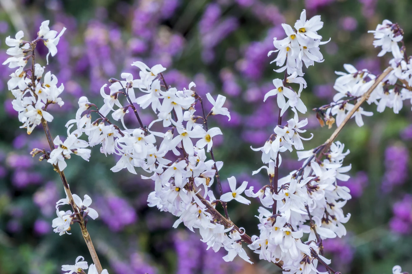 - Biała forsycja (Abeliofylium koreańskie) – kwitnie wcześnie, bo od marca aż do maja. Kwiaty są białe z lekkim odcieniem różu. Wyglądem przypominają kwiaty forsycji pośredniej, ale są drobniejsze i delikatniejsze. Urzekają nie tylko swoim wyglądem, ale i zapachem (pachną jak migdały).