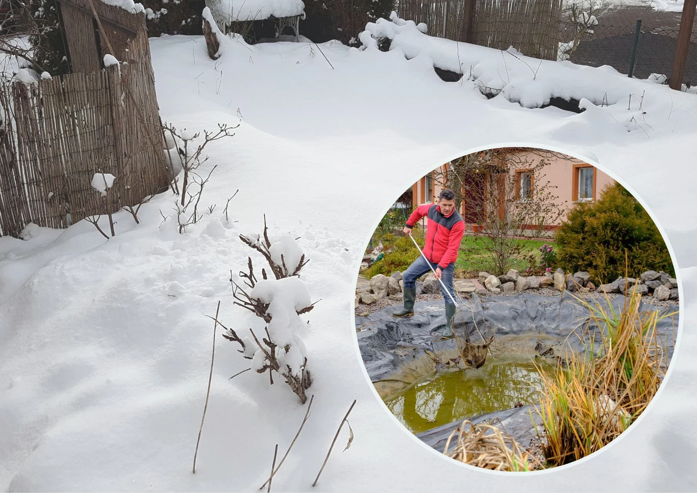 Musimy również pilnować, abypodczas większych mrozów lód nie zakrył całej powierzchni oczka wodnego. Mogłoby to zagrażać żyjącym tam rybom, ponieważ zabrakłoby im dostępu do powietrza. W przypadku, gdy powierzchnia zamarznie, to odpompowujemy nieco wody, aby pod lodem powstała 5-centymetrowa, ocieplająca poduszka powietrzna lub wiercimy przeręble.