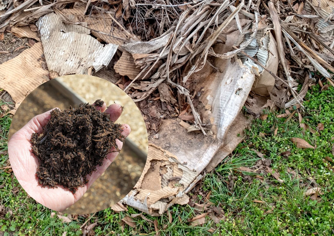 Pierwszy z nich, to zebranie kartonów z podłoża i przerobienie ich na kompost. Materiał można wykorzystać jako tzw. materię brązową będącą doskonałym źródłem węgla. Co istotne, po zakończeniu zimy, kartony rozłożone na zagonach są dość wilgotne i łatwo się rwą. Wobec tego łatwo i szybko można je pozbierać i umieścić na kompostowniku wraz z inną materią brązową, taką jak liście czy słoma.