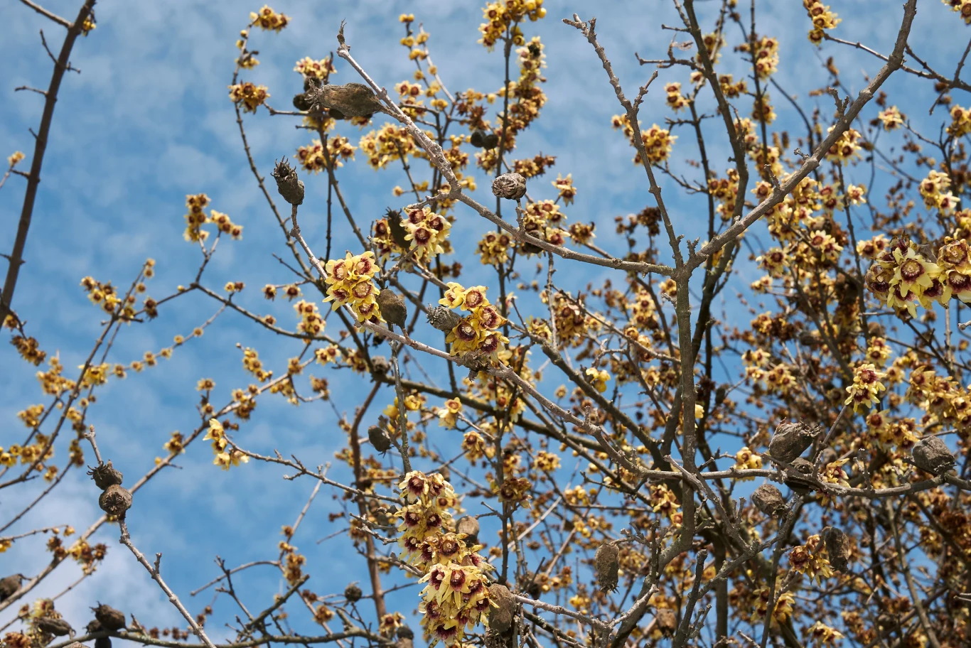 Na nagich pędach kwiaty pojawiają się od lutego do marca (czasem wcześniej w łagodne zimy). Mają dzwonkowaty kształt z jasnożółtymi, woskowatymi płatkami zewnętrznymi i purpurowo-brązowymi wewnętrznymi, co nadaje im charakterystyczny kontrast. Ich aromat jest intensywnie słodki, dzięki czemu może być wyczuwalny z dużej odległości w cieplejsze dni.