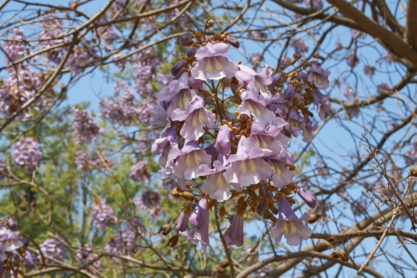 - Paulownia omszona ( Paulownia tomentosa) – zjawiskowo kwitnie od kwietnia do maja, a jej miododajne kwiaty są chętnie odwiedzane przez zapylacze. Rocznie przyrasta nawet o 2-3 m. Warto jednak pamiętać, że paulownia omszona jest ekspansywna i przy braku kontroli zdominuje ogród;