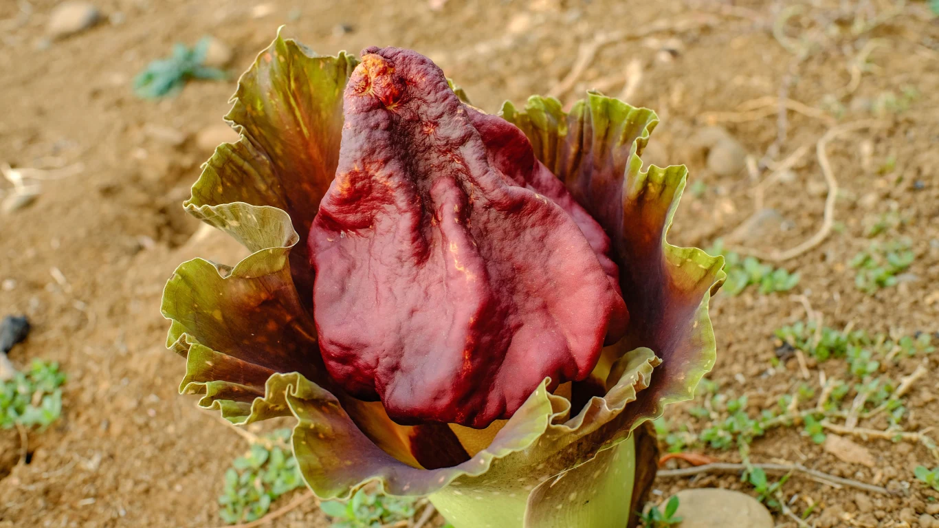 Otwarty kolbowy kwiatostan oglądać można jedynie przez 2-3 dni. W pierwszej nocy od otwarcia kolby pojawiają się kwiaty żeńskie. Podnosi się jej temperatura, co wzmacnia zapach padliny wytwarzany przez roślinę i sprawia, że roznosi się on na odległość nawet kilkuset metrów. Po przekwitnięciu żeńskich kwiatów, kolejnej nocy pojawiają się kwiaty męskie, co zapobiega samozapyleniu.