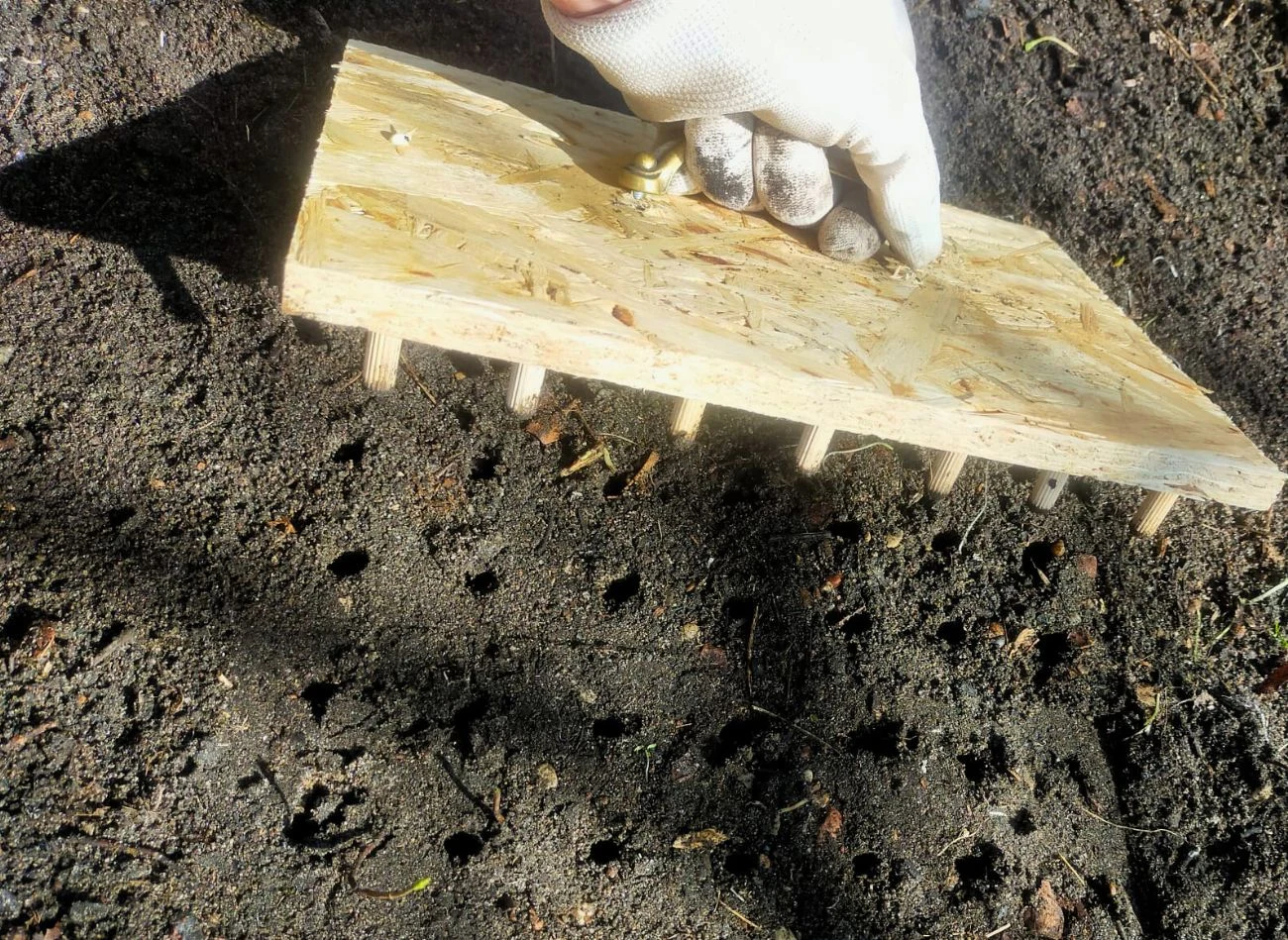 Powstałe punkty będą dla ciebie wyznacznikiem dla umiejscowienia kołków w desce – w efekcie kołki-znaczniki będą wskazywać narożniki niewielkich kwadratów. To właśnie bezpieczna rozstawa pomiędzy sadzonkami. W punktach przecięcia wykonaj nawierty o takiej głębokości, aby po włożeniu w nie kołeczków na wierzchu pozostało ok. 1,5 cm widocznego znacznika.