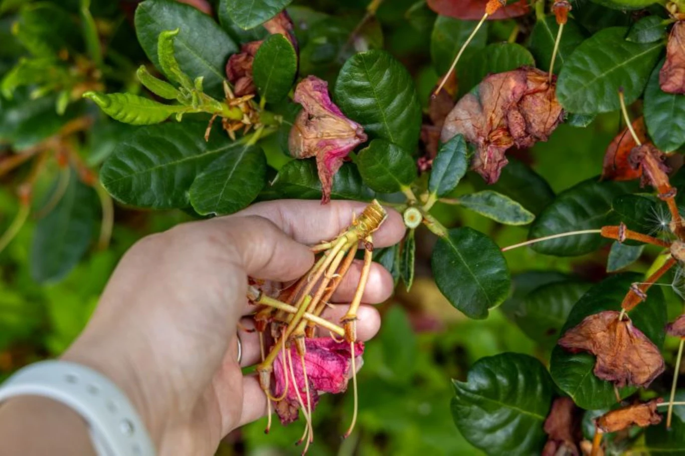 Suchych kwiatów rododendronów warto pozbywać się ręcznie. Wystarczy, że złapiemy je palcami u nasady i delikatnie odegniemy w bok, aby oderwały się znad liści. To bezpieczniejszy sposób niż korzystanie z sekatora, którym moglibyśmy uszkodzić krzew. Zabieg ten sprawi, że rododendron nie będzie wytwarzał nasion, dzięki czemu lepiej się zregeneruje i wykorzysta energię na zawiązywanie pąków kwiatowych na przyszły rok.