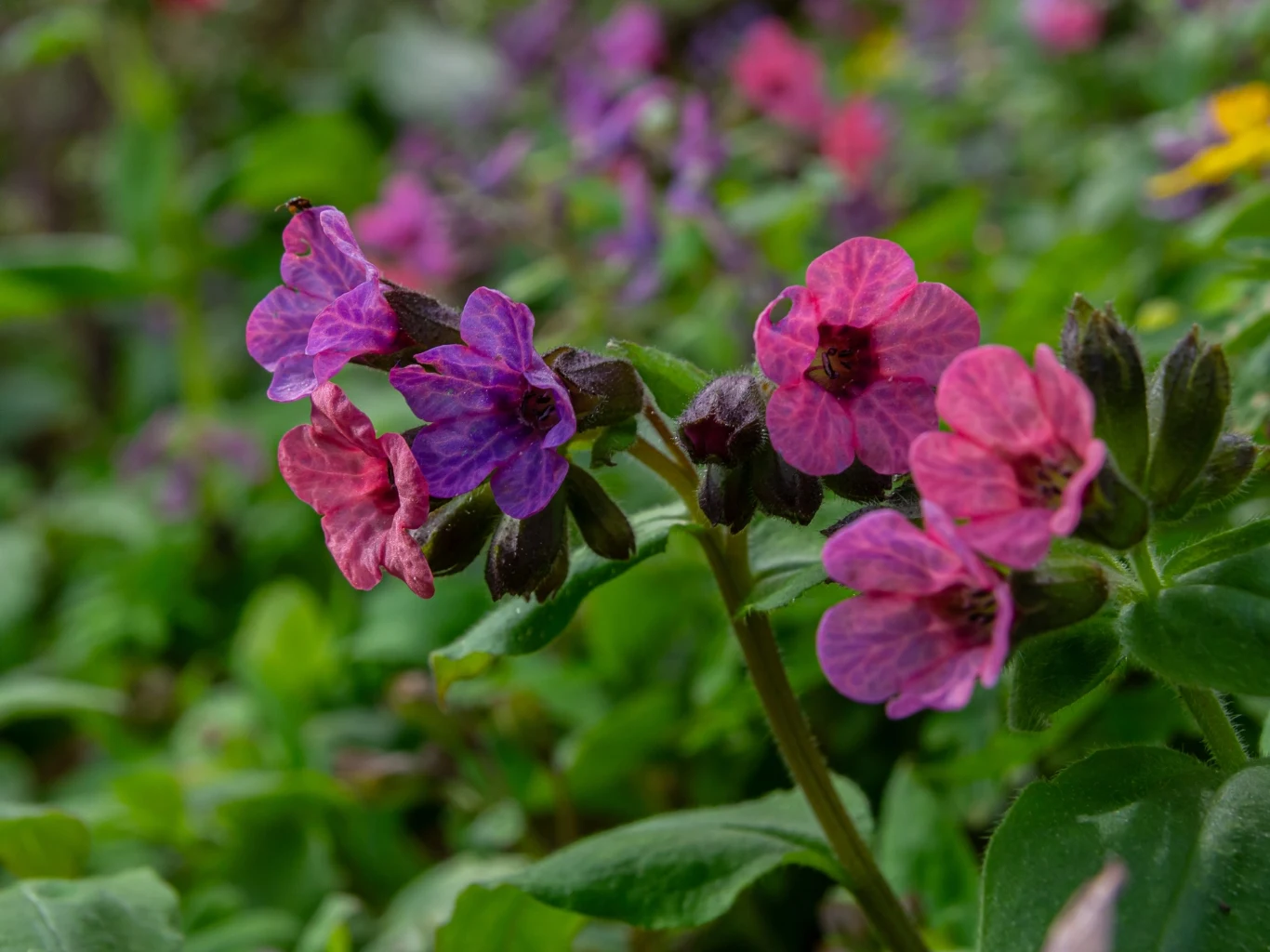 Kwiaty byliny są niewielkie, ale wyjątkowe. Pojawiają się bardzo wcześnie, bo już w marcu i w trakcie sezonu zmieniają kolor: najpierw są różowe lub czerwono‑fioletowe, a z czasem stają się niebieskie. Wynika to ze zmiany pH soków komórkowych w płatkach. Miodunka plamista nazwę zawdzięcza swoim najważniejszym cechom: plamistości liści i miododajności kwiatów. To jedne z pierwszych kwiatostanów pojawiających się wiosną i są dużą gratką dla wczesnych zapylaczy. Bylina zwana jest także płucnikiem, ponieważ jest ceniona w ziołolecznictwie za właściwości wykrztuśne.