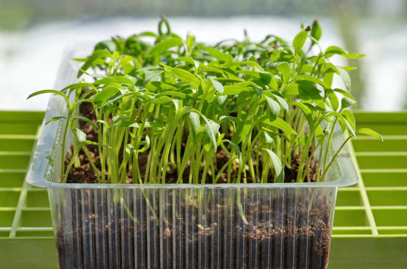 Gęste sadzonki pomidorów w przepuszczystym plastikowym pojemniku na jasnej powierzchni.