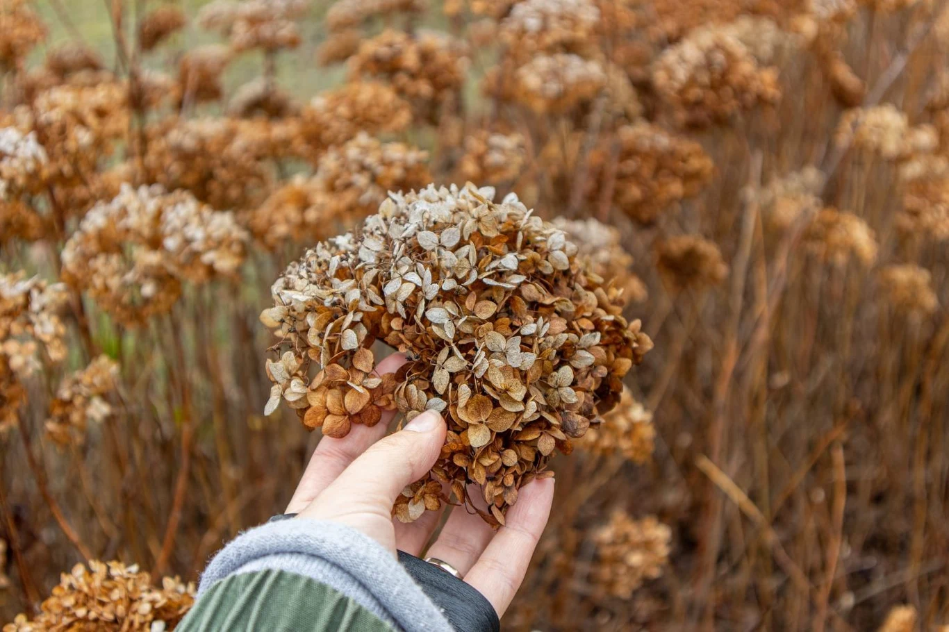 Hortensję bukietową przycinamy dopiero wiosną, skracając gałęzie o 1/3, a nawet o 2/3 długości. Z kolei hortensja ogrodowa zakwita na ubiegłorocznych pędach, dlatego lepiej nie wykonywać cięcia kwiatostanów, bo na kwiaty trzeba będzie zaczekać do kolejnego sezonu. W przypadku tej rośliny wykonujemy jedynie drobne cięcie higieniczne, pozbywając się pędów zniszczonych i słabych. Przed zimą jednak nie wykonujemy podobnych prac. Ważniejsze jest odpowiednie zabezpieczenie rośliny przed mrozem.