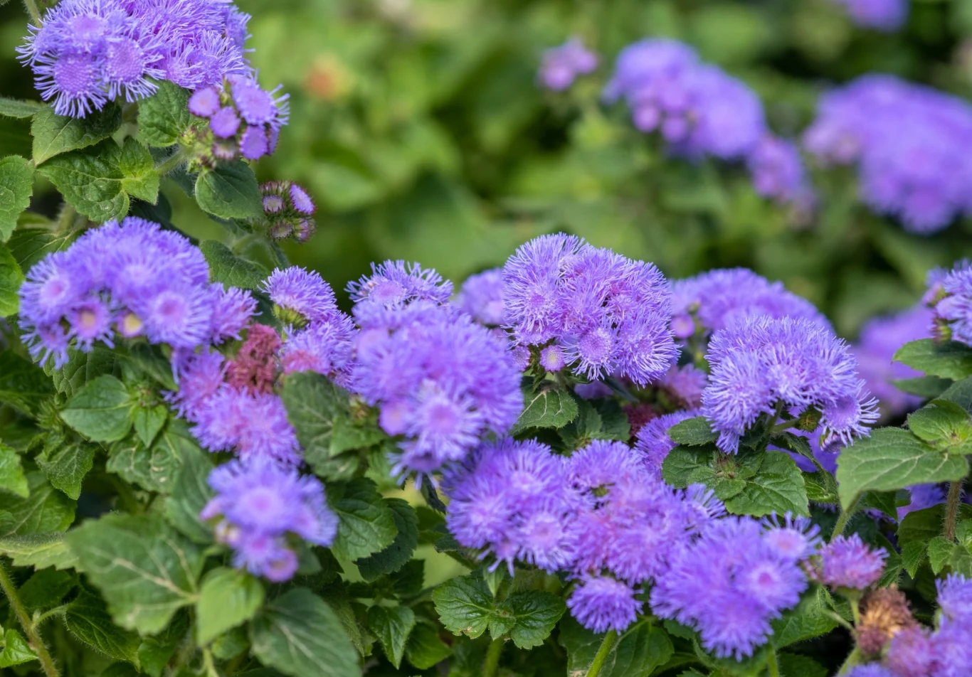 Żeniszek meksykański (Ageratum houstanianum) to jednoroczna roślina ozdobna z rodziny astrowatych, która sprawdzi się zarówno w uprawie gruntowej, jak i doniczkowej. Wyróżnia się krzaczastym pokrojem i sercowatymi liśćmi, ale największą ozdobą tej rośliny są jednak kwiaty. Pojawiają się one na szczytach pędów późną wiosną, a swoim wyglądem przypominają małe puchate kuleczki. Najczęściej przybierają one barwę niebieską lub fioletową, ale można też spotkać odmiany w kolorze różowym czy białym. Choć żeniszek nie jest bardzo wymagający, jeśli właściwie o niego zadbamy, będzie nam kwitł aż do przymrozków.