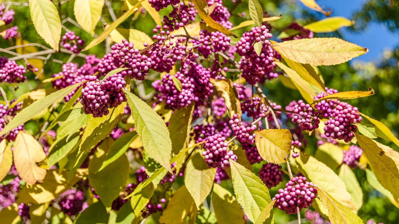 - Pięknotka Bodiniera ( Callicarpa bodinieri) – ozdobą tego krzewu są utrzymujące się do grudnia, zebrane w pęczki fioletowe owoce oraz przebarwiające się jesienią na złoto liście.