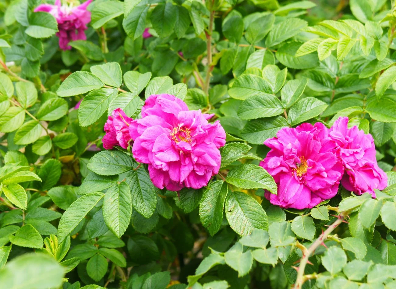 - odmiany róży pomarszczonej, np. 'Pink Pavement', 'Rotes Meer', 'Snow Pavement',