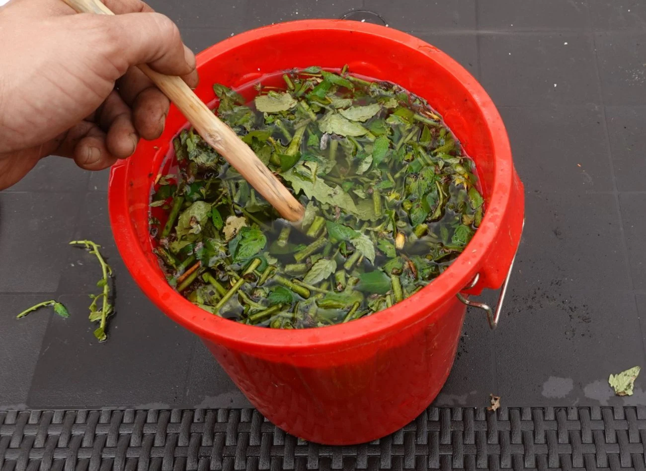 - Zmieszaj półprodukty w pojemniku i pozostaw odpowiednio długo, aby wytworzyła się esencja do oprysku. Pamiętaj o częstym mieszaniu gnojówki.