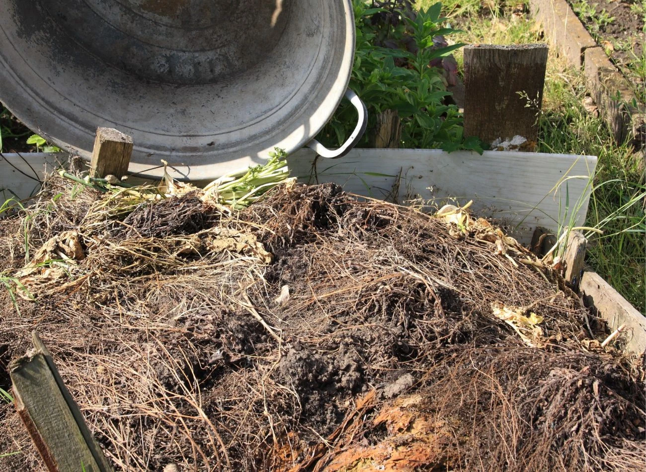 - 1/3 wsadu azotowego – materiał roślinny szybko kompostujący, zielony np. świeżo skoszona trawa, odpadki kuchenne warzywne, skorupki jaj czy fusy z kawy;