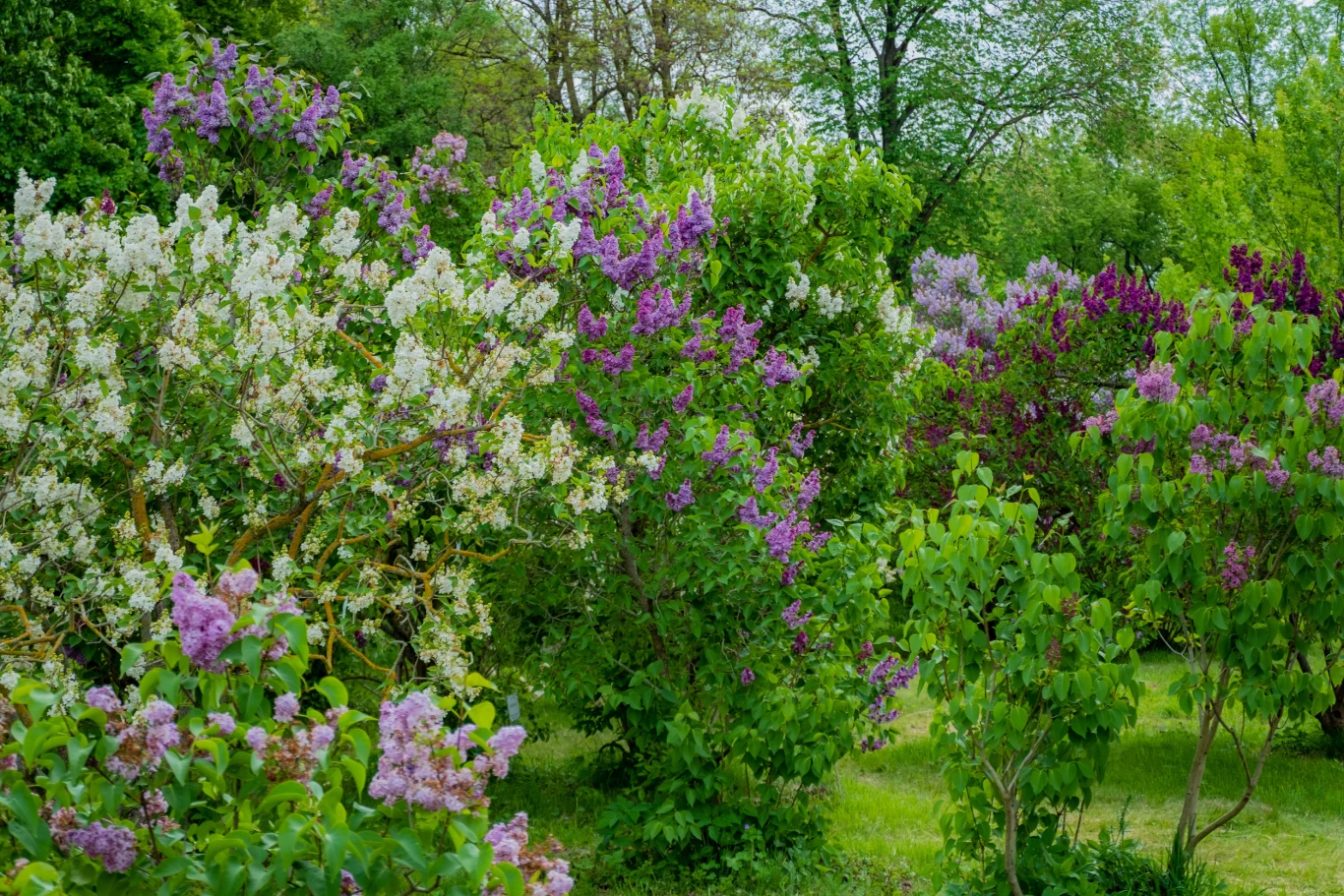 Gęste krzewy lilaka w odcieniach bieli, fioletu i purpury, wiosna, zieleń liści, ogród przy domu.