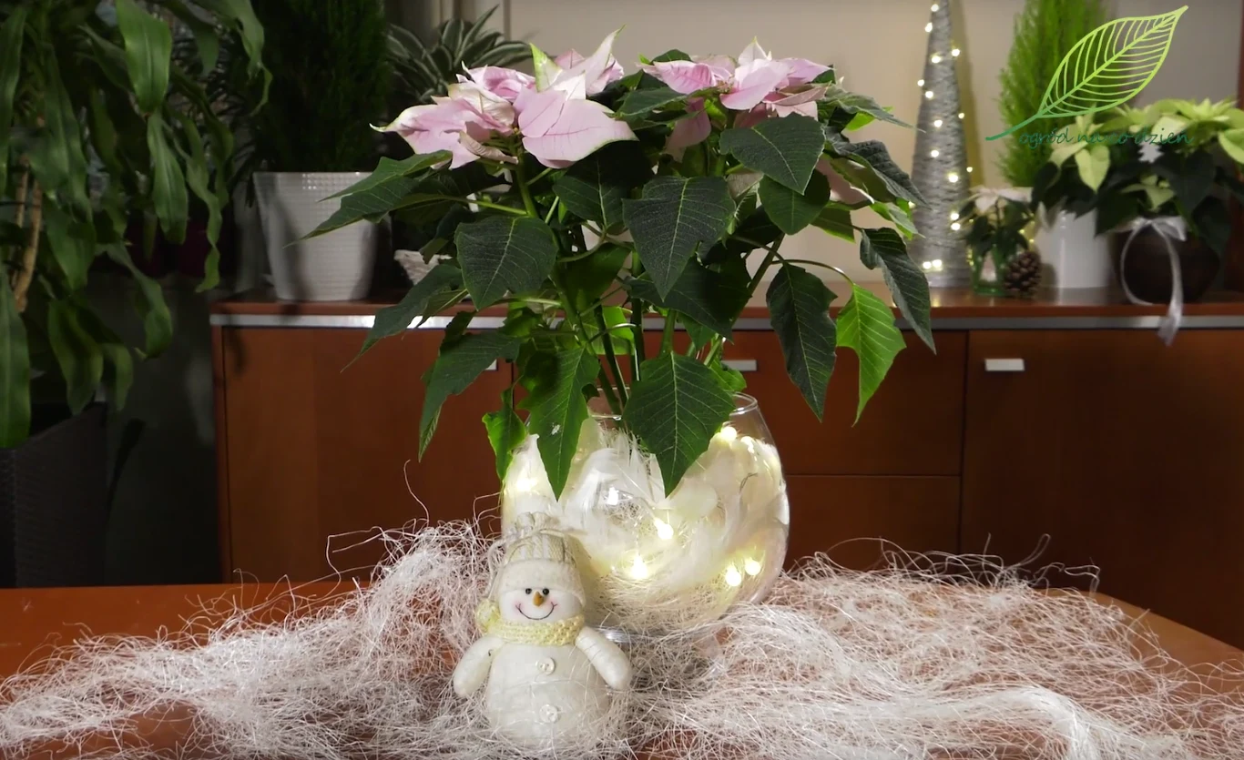 Dość duży okaz gwiazdy betlejemskiej w jasnoróżowym kolorze sam w sobie jest już przepiękną dekoracją. W jej przypadku warto jedynie zadbać o dodatki. Ja np. umieszczę tę roślinę w szklanym naczyniu, które dodatkowo wypełnię białym sizalem i piórkami, które nadarzą lekkości i puszystości. Do nich w naczyniu dołączy ledowy łańcuch z delikatnymi światełkami. Może to być zatem nie tylko bożonarodzeniowa dekoracja, ale także swoista wieczorna lampka. Dodatkowym akcentem może być tu białe serce z wikliny z kilkoma zielonymi iglastymi gałązkami i różową wstążką. Taką gwiazdę betlejemską podlewamy delikatnie i uważnie, dość często, ale niewielką ilością wody.