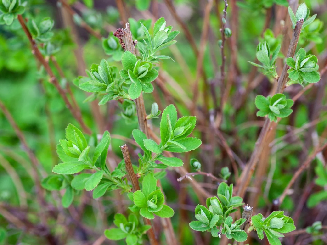 Świeża, intensywnie zielona roślina z licznymi młodymi listkami wyrastającymi z cienkich, brązowych gałązek, w tle rozmyte naturalne otoczenie.