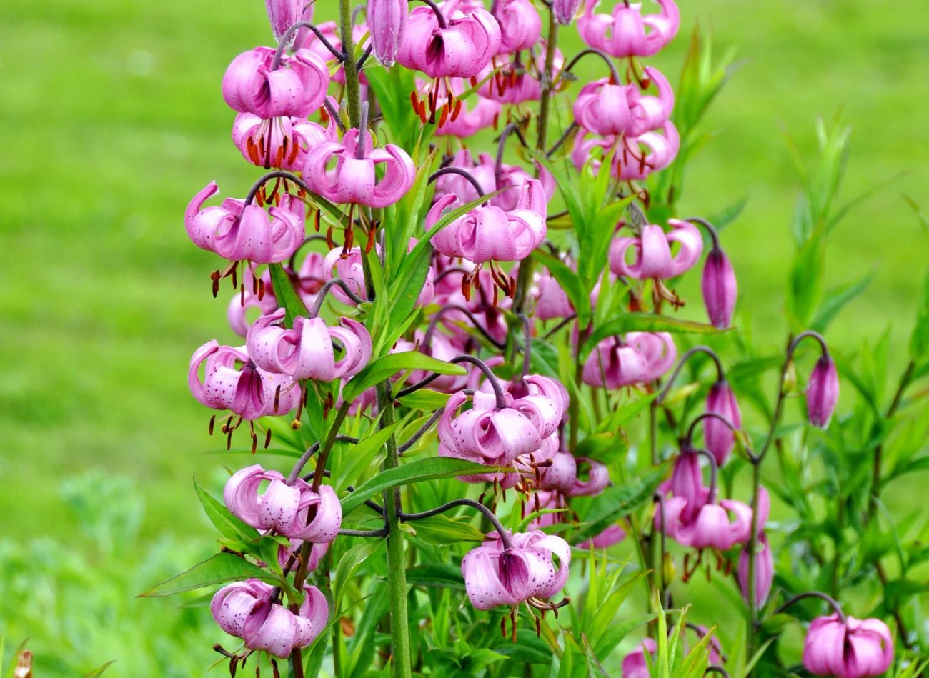 Lilia złotogłów (Lilium martagon) to gatunek wyjściowy dla wielu odmian ozdobnych, znany z naturalnych stanowisk rozciągających się od Pirenejów aż po Syberię. W warunkach dzikich roślina osiąga do 150 cm wysokości i rozwija okazałe kwiatostany złożone z kilkudziesięciu drobnych, turbanowatych kwiatów o charakterystycznie zawiniętych płatkach. Kwiaty najczęściej przybierają odcienie różu i purpury z ciemnymi nakrapianiami, a ich intensywny zapach wyczuwalny jest szczególnie wieczorem i w nocy. Niewielkie wymagania glebowe, tolerancja niskich temperatur i naturalna odporność na choroby sprawiły, że gatunek ten stał się podstawą dla licznych kultywarów obecnych w całej Europie.