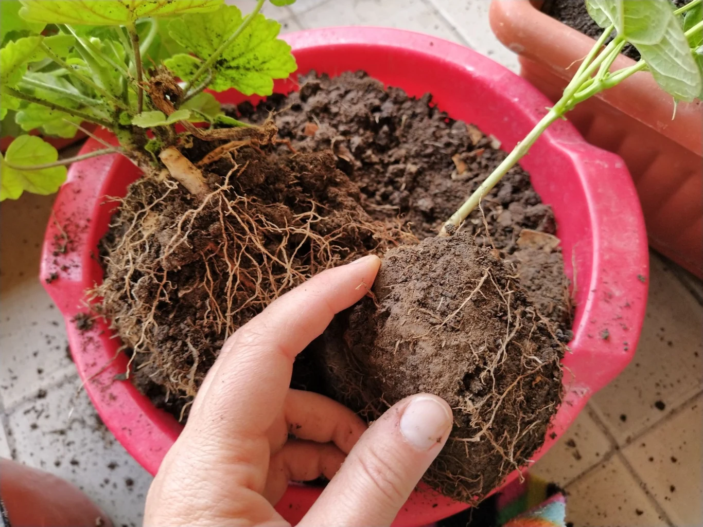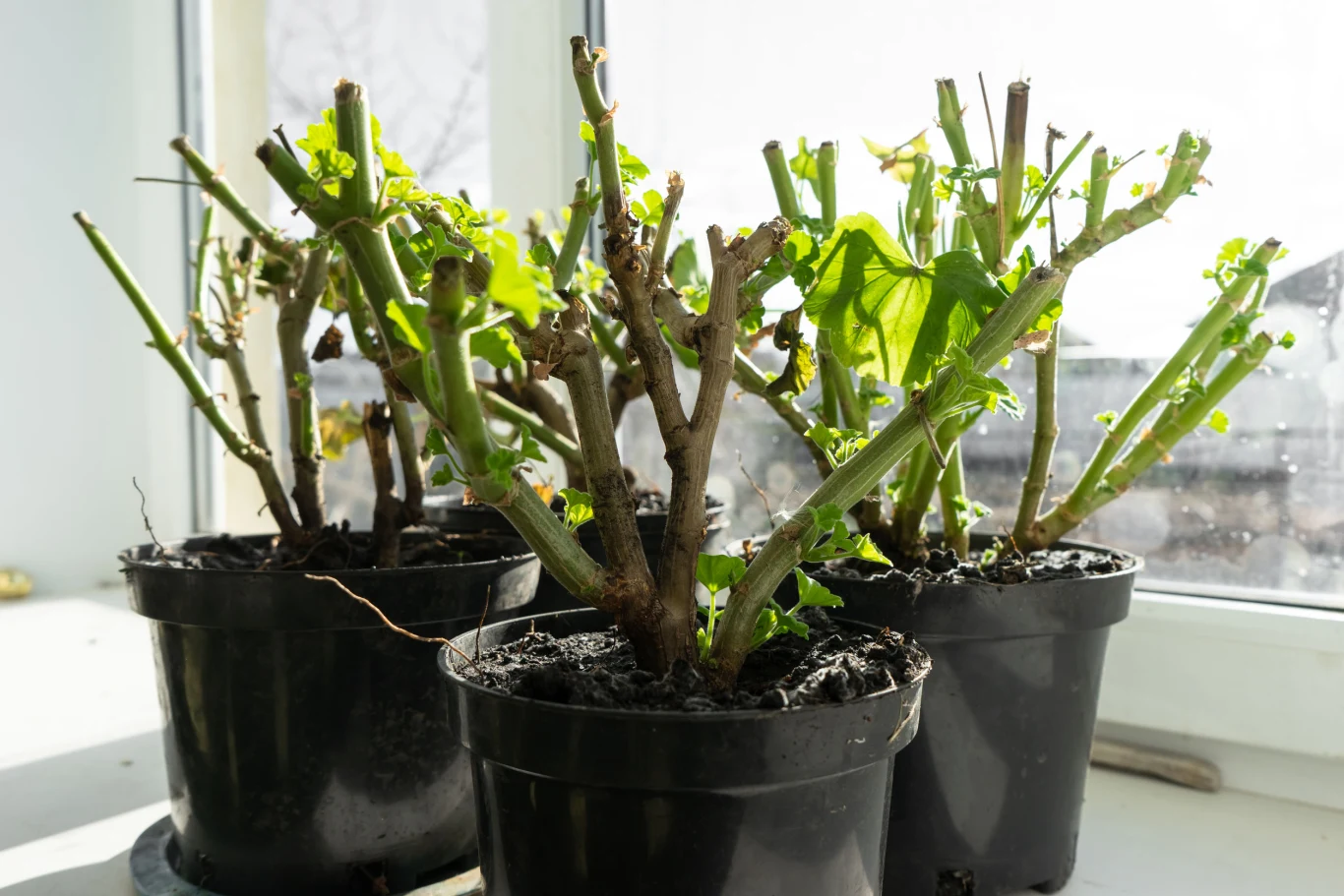 Aby uzyskać zwarte egzemplarze zimowanych pelargonii, ich przycięcie jest konieczne. Najczęściej robi się to nad 3-5 pąkiem, ale warto zawsze przyjrzeć się roślinie, sprawdzić, które gałęzie są uschnięte, gdzie widać pojawiające się młode liście. Może chcemy, wzorem krajów śródziemnomorskich, pozwolić roślinom na nieco swobodniejszy wzrost. Wszystko zależy od nas. Na pewno należy usunąć wszystkie zaschnięte liście i martwe fragmenty bylin. Przesadzając rośliny do nowych donic, skracamy od razu korzenie. Tak odmłodzone okazy, podlane i postawione w jasnym, ciepłym miejscu będą miały mnóstwo energii do ponownego wzrostu.