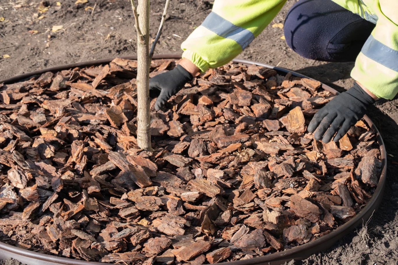 - Zostaw kilkucentymetrowy odstęp między ściółką a korą pnia, by zapobiec gniciu.