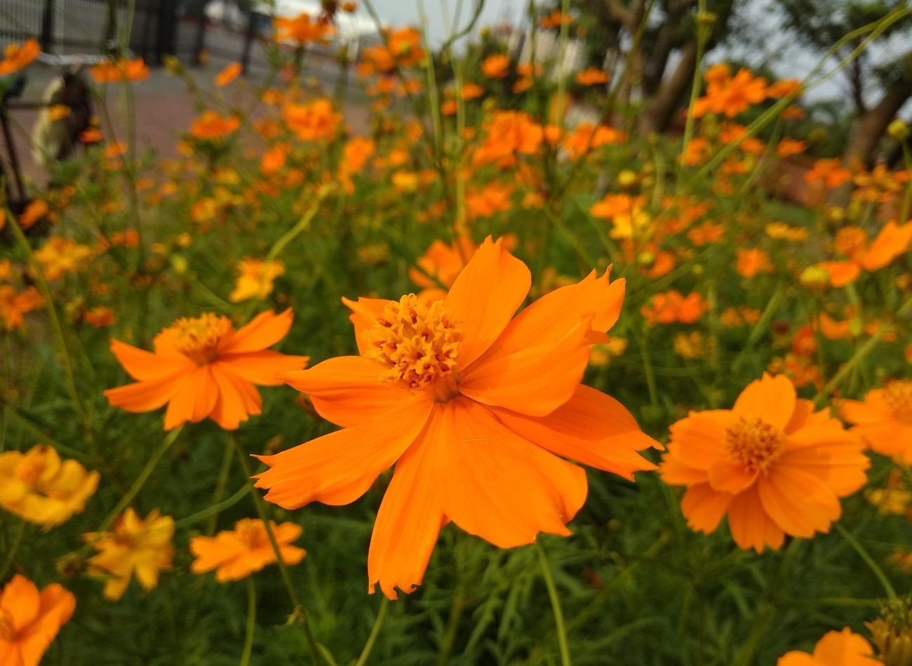 Kosmos siarkowy kwitnie w intensywnych odcieniach. Chętnie umieszcza się go na pierwszym planie kompozycji. Fot. naturespot21/CanvaPro