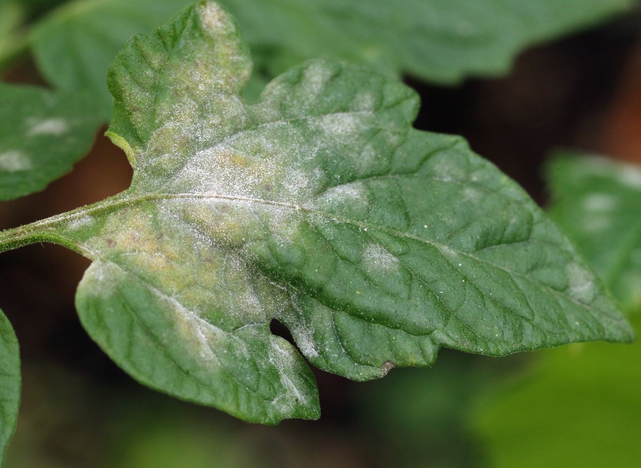Mączniak prawdziwy to również choroba grzybowa. Jej objawy są jednak prostsze do rozpoznania. Na górnej stronie liści pojawiają białe, drobne, okrągłe plamy, które z czasem zlewają się z sobą i pokrywają całe blaszki liściowe. Objawy dostrzegalne są także na ogonkach liściowych, pędach oraz działkach kielicha. Choroba nie poraża jednak owoców. Porażone części rośliny szybko więdną i zamierają, a pomidor słabiej się rozwija, przez co daje gorszy plon.