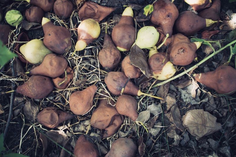 Szkodliwe są nie tylko owocowe mumie wiszące na drzewie, ale też te, które spadły na ziemię. Fot. 123Rf.com